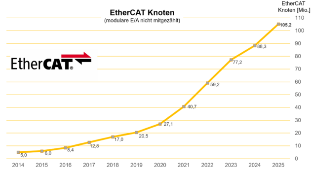 Mit 105,2Mio. Knoten hat Ethercat die 100Mio.-Marke deutlich überschritten und seine Stellung im Bereich industrielle Echtzeit-Ethernet-Systeme weiter gefestigt. Im Jahr 2025 kamen 16,9Mio. neue Knoten hinzu. Die Daten basieren auf den von den Chipherstellern gemeldeten Stückzahlen und folgen einer bewusst konservativen Methodik: Multiprotokoll-Chips werden nur anteilig berücksichtigt, FPGA-Implementierungen fließen mit lediglich 10% in die Zählung ein, und modulare Ein-/Ausgabe-Baugruppen werden nicht mitgezählt. Dadurch gäben die Zahlen den tatsächlichen Ethercat-Markt realistisch wieder und vermieden Überschätzungen