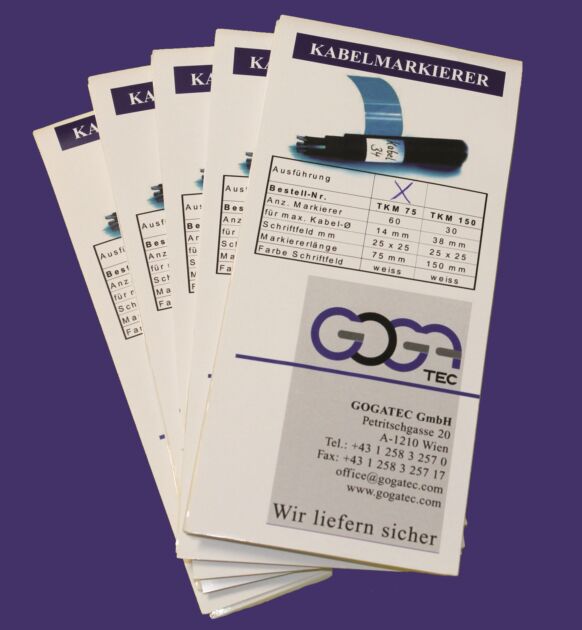 Die selbstlaminierenden Kabelmarkierer zur Handbeschriftung von Gogatec gibt es auch in handlichen Taschenpackungen für die Montage im Außendienst. Der Markier-Streifen besteht aus einem weißen Beschriftungsfeld und einem transparenten Schutzschild. Das Schriftfeld kann mit Bleistift oder dokumentenechtem Kugelschreiber beschriftet werden. Falls ein Faserschreiber eingesetzt wird, sollte unbedingt eine UV-beständige Ausführung verwendet werden. Nach dem Beschriften wird der Markierer mit dem Fixierteil am Kabel angedrückt und um das Kabel herumwickelt. Das Schriftfeld ist nun durch eine klare Folie dauerhaft geschützt sowie öl- und wasserfest. Das Material Vinyl ist mit einem permanenten Acrylkleber versehen und bei einem Temperaturbereich von -30 bis +60°C einsetzbar. Es sind Größen für Kabeldurchmesser von 9 bis 63mm lieferbar. Ab 100 Stück können die Markier-Blocks auch mit individuellem Firmenlogo und Adresse auf dem Deckblatt bedruckt werden.