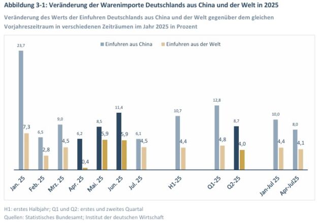 Gerade Produkte, die die USA weniger aus China importieren, landen zunehmend in Deutschland. In 1.558 Warengruppen, in denen die US-Importe aus dem Reich der Mitte zurückgingen, stiegen die deutschen Warenimporte im zweiten Quartal 2025 von dort mengenmäßig um mindestens 10% gegenüber dem Vorjahreszeitraum. Zusammen machten die Warengruppen fast 52% aller deutschen Einfuhren aus China aus. Auffällig zudem: Bei vielen Produkten aus dem Kernbereich der Industrie, bei denen Deutschland einen Exportüberschuss hat, sind die deutschen Importe aus China im zweiten Quartal 2025 zum Vorjahr besonders kräftig gestiegen – zum Teil sogar um über 100%.