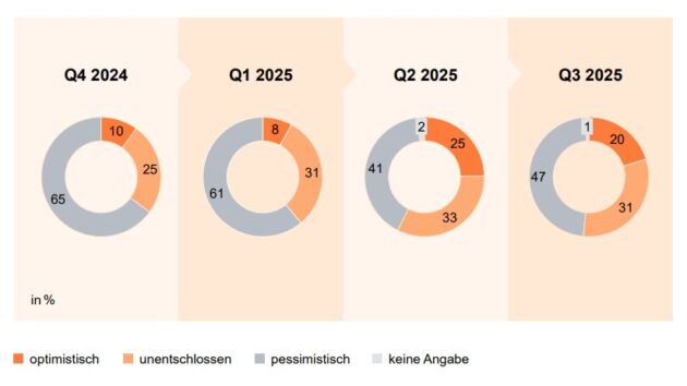 Der deutsche Maschinen- und Anlagenbau befindet sich in einer Abwärtsspirale aus zu hohen Kosten, unterdurchschnittlicher Produktion und zunehmend schwierigen Wettbewerbsbedingungen. Eine Trendwende in diesem Jahr ist nicht mehr in Sicht, wie aus dem aktuellen Maschinenbau-Barometer der Wirtschaftsprüfungs- und Beratungsgesellschaft PwC Deutschland hervorgeht. Die Stimmung im deutschen Maschinen- und Anlagenbau ist drei Monate vor Jahresende nach leichter Hoffnung auf eine Trendwende vor dem Sommer wieder eingetrübt. Fast die Hälfte der Entscheidungsträger blickt dezidiert pessimistisch auf die weitere Entwicklung der deutschen Wirtschaft. Lediglich jeder fünfte Entscheider geht derzeit noch von einem Wachstum aus. Mit einem weiteren Rückschlag rechnet die Branche auch auf dem Weltmarkt, der derzeit stark von geopolitischen Krisen, Kriegen und Handelsbeschränkungen, insbesondere durch die US-Zölle, gekennzeichnet ist. Entsprechend erwartet das Gros der Befragten eine negative Entwicklung der globalen Konjunktur (45%); lediglich 19% haben die Hoffnung auf Wachstum noch nicht aufgegeben. Diese Skepsis gegenüber der globalen Konjunktur wirkt sich negativ auf die Umsatzprognose der Entscheidungsträger aus. Lediglich ein Viertel glaubt an ein Wachstum der Gesamtbranche, 64% rechnen damit, dass sie schrumpft.