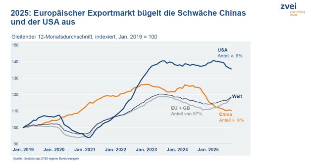Mit einem Plus von 4,6% auf 236,2Mrd.€ (Januar – November) entwickelten sich auch die deutschen Elektroexporte (einschließlich der Re-Exporte) erfreulich. Entscheidend dafür waren die Ausfuhren in den EU-Binnenmarkt und ins Vereinigte Königreich. Sie bügelten die Rückgänge in den USA und China aus.