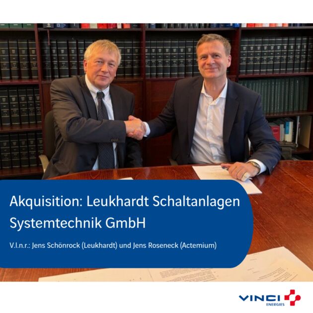 Vinci Energies hat am 11.12.2024 die Leukhardt Schaltanlagen Systemtechnik mit Sitz in Schwerin übernommen. Das Unternehmen ist im Bereich der Planung, Herstellung und Installation von industriellen Schaltanlagen und Steuerungen, insbesondere Niederspannungsschaltanlagen und den damit im Zusammenhang stehenden ingenieurtechnischen Dienstleistungen tätig. Durch diese Übernahme erweitert Vinci das Leistungsspektrum ihrer Industriemarke Actemium, einem Full-Service-Anbieter für industrielle Prozesslösungen, in den Bereichen Energieanlagen- und Automatisierungstechnik in Deutschland.