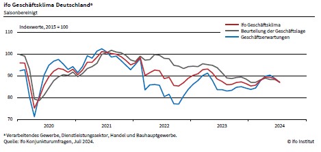 Die Stimmung der Unternehmen in Deutschland hat sich merklich eingetrübt. Der Ifo Geschäftsklimaindex sank im Juli auf 87,0 Punkte, nach 88,6 Punkten im Juni. Die Unternehmen waren weniger zufrieden mit den laufenden Geschäften. Mit Blick auf die kommenden Monate hat die Skepsis merklich zugenommen. Die deutsche Wirtschaft steckt in der Krise fest. Im Verarbeitenden Gewerbe ist das Geschäftsklima deutlich gesunken. Insbesondere die Urteile zur aktuellen Lage fielen erheblich schlechter aus. Auch die Erwartungen trübten sich ein. Die Auftragsbestände waren erneut rückläufig. Die Kapazitätsauslastung ist auf 77,5% gefallen und liegt damit sechs Prozentpunkte unter dem langfristigen Mittelwert. Im Dienstleistungssektor ist der Index nach der Erholung in den letzten Monaten wieder gesunken. Dies war vor allem auf pessimistischere Erwartungen zurückzuführen. Ihre aktuelle Lage beurteilten die Dienstleister ebenfalls etwas weniger gut. Auch im Handel hat sich das Geschäftsklima verschlechtert. Die Unternehmen waren mit den laufenden Geschäften weniger zufrieden. Dies gilt insbesondere für den Einzelhandel. Auch bei den Erwartungen zeigten sich größere Zweifel. Im Bauhauptgewerbe hat der Index nachgegeben. Die Firmen beurteilten ihre Geschäftslage etwas schlechter. Die Erwartungen blieben nahezu unverändert von deutlichem Pessimismus geprägt.