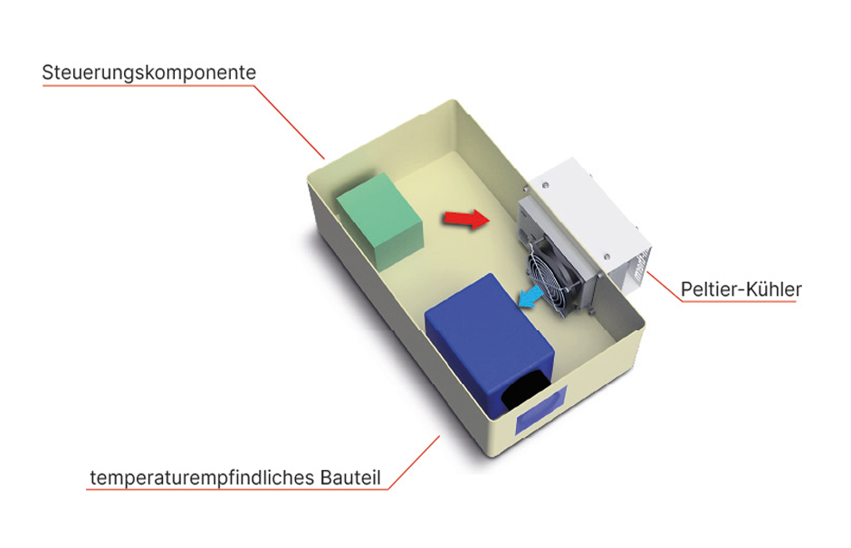 Eine energieeffiziente Alternative stellt die partielle Kühlung mittels Peltiertechnik dar. Hierbei gibt die Warmseite des Peltier-Kühlgeräts die Verlustleistung an die Umgebung ab, während die Kaltseite gezielt die empfindlichen Bauteile kühlt. Dadurch kann die Schaltschrankinnentemperatur auf bis zu 60°C ansteigen, ohne dass die funktionale Sicherheit der temperaturempfindlichen Komponenten beeinträchtigt wird. Falls die zulässige Innenraumtemperatur des Schaltschranks noch Reserven für zusätzliche Verlustleistung aufweist, kann die partielle Kühlung auch mit einer Lösung realisiert werden, bei der die Verlustleistung der Peltier-Kühlung in den Schaltschrankinnenraum abgegeben wird. Diese Wärme kann über die Schaltschrankwand an die Umgebung dissipiert werden. Zusätzlich zur Luftstromkühlung besteht die Möglichkeit, temperaturempfindliche Bauteile durch direkte Kontaktkühlung mittels Cold-Plate-Technologie unterhalb ihrer maximal zulässigen Temperatur zu halten. Diese Methode bietet eine besonders effiziente Wärmeabfuhr und trägt zur Verbesserung der Temperaturverhältnisse im Schaltschrank bei. Verglichen mit Kompressorkühlgeräten bieten Peltierkühleräte die Vorteile, dass sie unempfindlich gegen Schock und Vibration sind und lageunabhängig betrieben werden können. Ein weiterer wichtiger Vorteil ist der Betrieb ohne umweltschädliche Kältemittel.