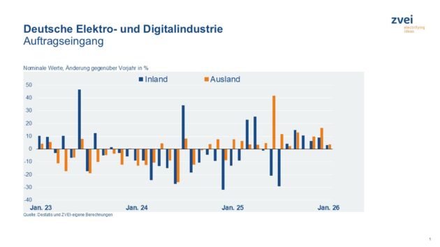 Im gesamten Jahr 2025 waren die Auftragseingänge in der deutschen Elektro- und Digitalindustrie um – zwischenzeitlich leicht revidierte – 5,7% gestiegen. Dabei nahmen die Bestellungen aus dem Inland kaum zu (+0,2%). Die Auslandsorders waren mit +10,2% umso stärker gestiegen (+8,1% im Euroraum, +11,2% im übrigen Ausland).
