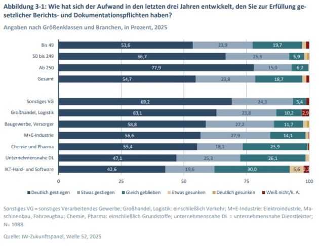 Rund 80% der Unternehmen in Deutschland berichten von einem gestiegenen Aufwand für die Erfüllung gesetzlicher Berichts- und Dokumentationspflichten in den vergangenen drei Jahren. Mehr als die Hälfte spricht dabei von einem deutlichen Anstieg. Das zeigt eine repräsentative Unternehmensbefragung des IW aus dem Herbst 2025, an der mehr als 1.000 Betriebe teilnahmen. Eine sinkende Belastung geben gerade einmal 1,5% der Unternehmen an, und knapp jedes fünfte Unternehmen sieht keine Veränderung.