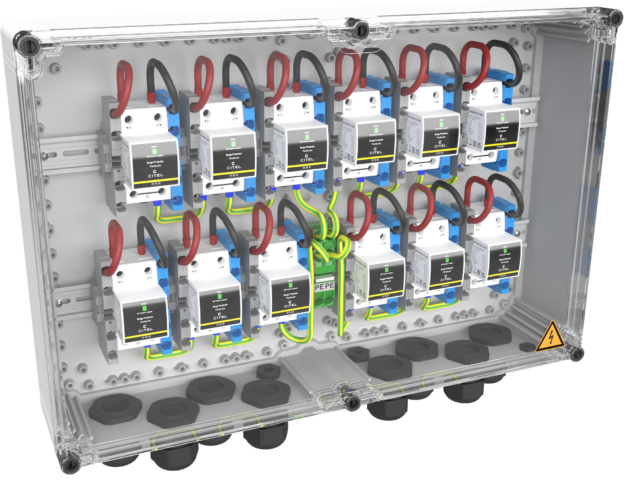 Citel bringt die Generatoranschlusskastenserie GAK 12 XS für große PV-Anlagen auf den Markt. Die vier Modelle können Solarstromanlagen mit maximalen Dauerspannungen (Ucpv) von bis zu 1.200VDC und bis zu 12 MPP-Trackern vor Blitz- und Überspannungsimpulsen schützen. Je nach Konfiguration sind die Geräte für PV-Anlagen der Blitzschutzklasse III/IV (Typ 2+3) bzw. PV-Freiflächensysteme (Typ 1+2+3) optimiert. Die neuen Generatoranschlusskästen eignen sich für PV-Installationen, die dauerhaft mit einer Spannung von 1.000VDC betrieben werden. Sie haben zwei Eingänge und einen Ausgang für den Anschluss von 6-10mm² Leitungen über Federkraftklemmen. Weil Citel sehr viel Wert auf qualitativ hochwertige Produkte und maximale Sicherheit legt, ist auch die GAK12 XS-Serie mit den weltweit ersten PV-Kombiableitern Typ 1+2+3 bzw. Typ 2+3 für die DC-Seite ausgestattet. Dadurch sind auch die sensibelsten Komponenten wie beispielsweise Kommunikationsschnittstellen vor Überspannungen schützt. Die Kabeldurchgänge sind fest verschraubt, was die Installation vereinfacht, weil man keine Löcher stanzen muss. Die patentierte VG-Technologie verhindert eine vorzeitige Alterung.