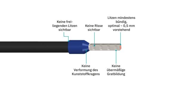 Ein unbehandeltes Leiterende kann sich spreizen – vergleichbar mit einem ausgefransten Schnürsenkel. Aderendhülsen bündeln die Litzen, verhindern das Aufspleißen und ermöglichen durch Crimpen eine definierte Kontaktfläche für eine sichere elektrische Verbindung. Sie sind in verschiedenen Querschnitten und Längen erhältlich und oft mit farbigem Kunststoffkragen versehen, der die Einführung erleichtert und den Querschnitt kennzeichnet. Ausgelegt sind Aderendhülsen für Leiter der Klassen 2, 5 und 6 nach der DIN EN IEC60228. Beim Abgleich von Aderendhülse und Leiter ist zu beachten, dass sich die Querschnitte der Hülsen nach geometrischen Abmessungen richten, während die Leiterquerschnitte auf elektrischen Widerstandswerten basieren. Wichtig ist, dass die Hülsenlänge zur Kombination aus Leiter und Klemmraum passt. Eine zu lange Hülse erschwert die Montage, eine zu kurze gefährdet den sicheren Anschluss.