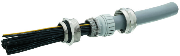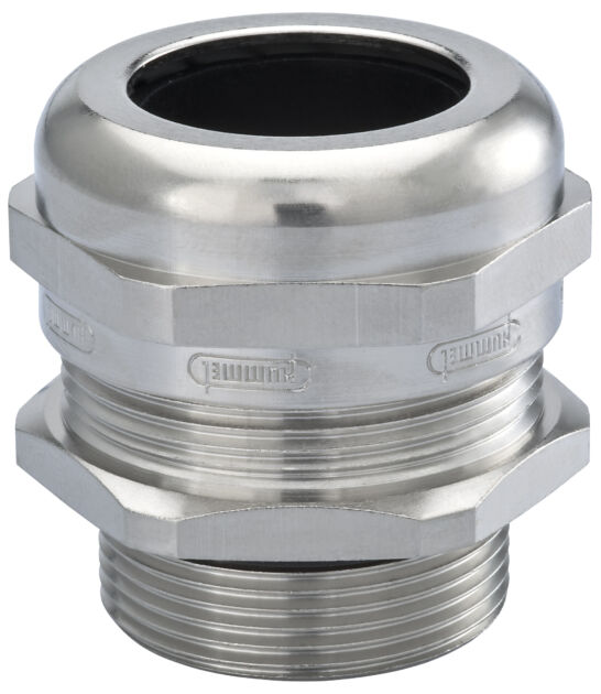 Bild 3 | EMV-Kabelverschraubung aus Metall in Größe M32 mit langem Anschlussgewinde. Diese Verschraubung wird eingesetzt, wenn elektromagnetische Verträglichkeit gefordert ist. – Bild: Hummel AG