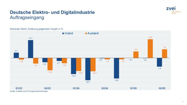 Mit 20,7Mrd.€ lag der Umsatz in der deutschen Elektro- und Digitalindustrie im September 2025 9,3% über Vorjahr. Der Inlandsumsatz rückte um 10,3% auf 9,9Mrd.€ vor, der Auslandsumsatz um 8,4% auf 10,8Mrd.€. Die Geschäfte mit dem Euroraum beliefen sich auf 4,2Mrd.€ (+16,4%), die mit Partnern aus Drittländern auf 6,6Mrd.€ (+4,3%).