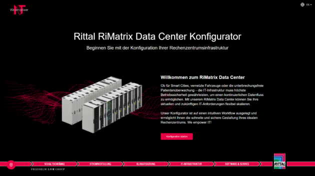 Mit dem neuen Online-Konfigurator von Rittal können Rechenzentrumsinfrastrukturen selbst geplant werden. Mit wenigen Klicks kommen Nutzer zu einer möglichen Konfiguration mit allen wesentlichen Elementen der RiMatrix Plattform. Mit dem Tool sind Rack, Power, Cooling, Monitoring und Sicherheitsmechanismen schnell geplant. Intelligente Algorithmen prüfen die ausgewählten Konfigurationen dabei auf Plausibilität. Mittels 3D-Darstellung ist eine realistische Visualisierung der individuellen Lösung inklusive einer vollständigen Stückliste zu sehen.