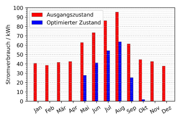 Abbildung 3 zeigt für beide Szenarien die für die Kühlung des Schaltschranks aufzuwendende elektrische Energie (Stromverbrauch), beschränkt auf das Kühlgerät. Es ist ersichtlich, dass das Kühlgerät im Ausgangszustand (rote Balken) in jedem Monat läuft bzw. aktiv ist. In den Sommermonaten ist der Stromverbrauch logischerweise höher, da der Kühlbedarf in dieser Zeit durch die geringe Temperaturdifferenz zur Umgebung ebenfalls steigt. Im optimierten Zustand (blaue Balken) ist die Laufzeit des Kühlgeräts hauptsächlich auf die Monate Mai bis September begrenzt. Im August wird der kumulierte Stromverbrauch von etwa 95 auf rund 64kWh reduziert. Der Airblower ist hier noch nicht berücksichtigt, wird jedoch in einer abschließenden kumulierten Betrachtung einbezogen.