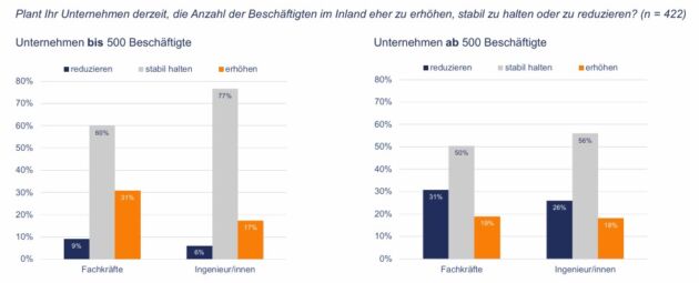 Laut der neuen VDMA-Ingenieurerhebung, an der gut 400 Maschinenbaubetriebe teilgenommen haben, wollen 77% der befragten Unternehmen (bis 500 Beschäftigte) die Anzahl ihrer Ingenieurinnen und Ingenieure stabil halten. Weitere 17% gehen sogar von einer Erhöhung aus. Weniger positiv sind die Erwartungen bei den größeren Unternehmen. Jedes vierte Unternehmen rechnet hier mit einer rückläufigen Zahl und nur 56% gehen von einer stabilen Entwicklung aus. Gleichzeitig bestehen weiterhin Engpässe auf dem Arbeitsmarkt: 54% der Unternehmen berichten von leichten, 17% von starken Engpässen, die richtigen Ingenieurkräfte zu finden. „Der Druck auf unseren Innovationsstandort wächst und das gleich an mehreren Fronten“, kommentiert Hartmut Rauen, stellvertretender VDMA-Hauptgeschäftsführer, die Ergebnisse. „Eine wesentliche Basis unserer Innovationskraft droht zu erodieren.“ Denn der Trend bei den Ingenieuren spiegelt sich auch in der Forschung wider: Vor allem große Unternehmen rechnen laut Erhebung mittlerweile mit einer stärkeren Ausweitung ihrer FuE-Aufwendungen im Ausland als im Inland.