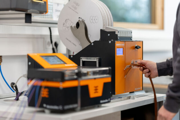 Bild 2 | Teilautomatisierte Leiterkonfektionierung bei S&A: Crimpen der Leitungen mit dem Crimpfix Vario am Wire Processing Center (WPC). Bild: Weidmüller GmbH & Co. KG